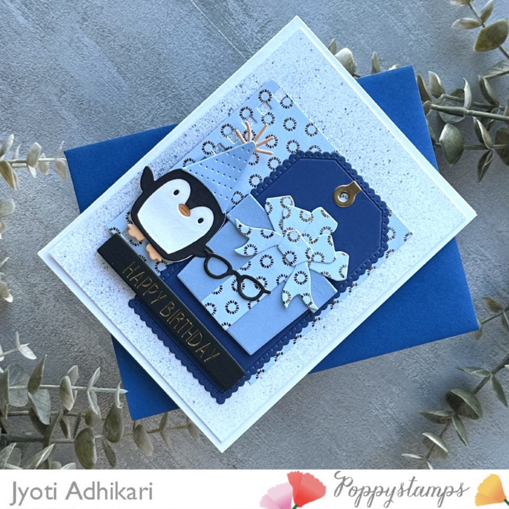 Next, I die-cut the adorable Fancy Party Penguin, dressing him up with a little blue party hat. I placed the penguin slightly off-center on the tag to give a bit of whimsy. The tag itself is cut from navy cardstock, and the little gift box, also from Poppystamps, uses light blue and for the ribbons the same patterned paper as the background for a cohesive look.