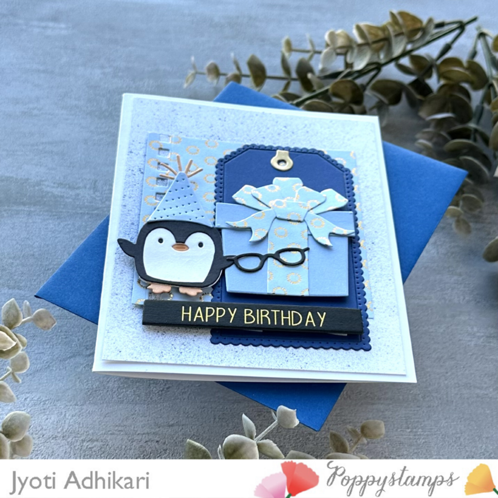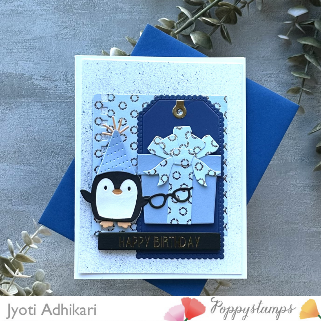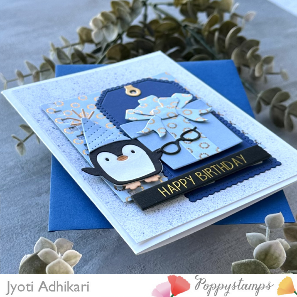 For today’s project, I had so much fun bringing a little party-ready penguin to life! Using the Fancy Party Penguin die from Poppystamps as the centerpiece, I created a cheerful birthday card that’s both playful and elegant.