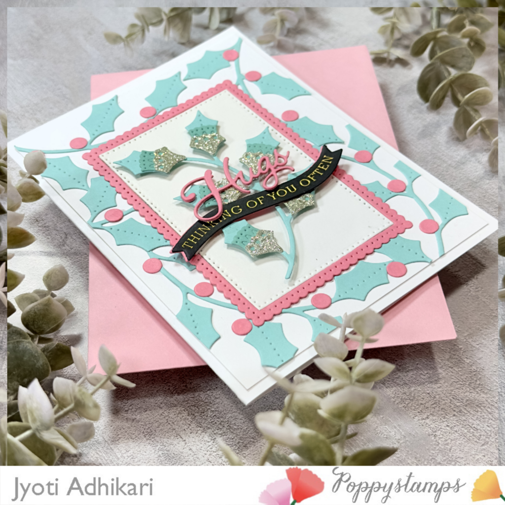 This card came together as a clean, elegant holiday design with a cozy Nordic feel, simple layers, soft color contrast, and just enough sparkle to make it feel special. I wanted the holly to be the star of the card, framed in a way that felt polished but not heavy.