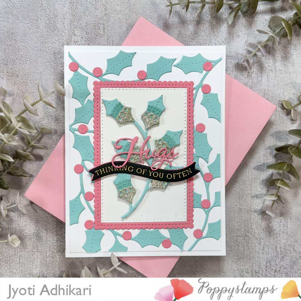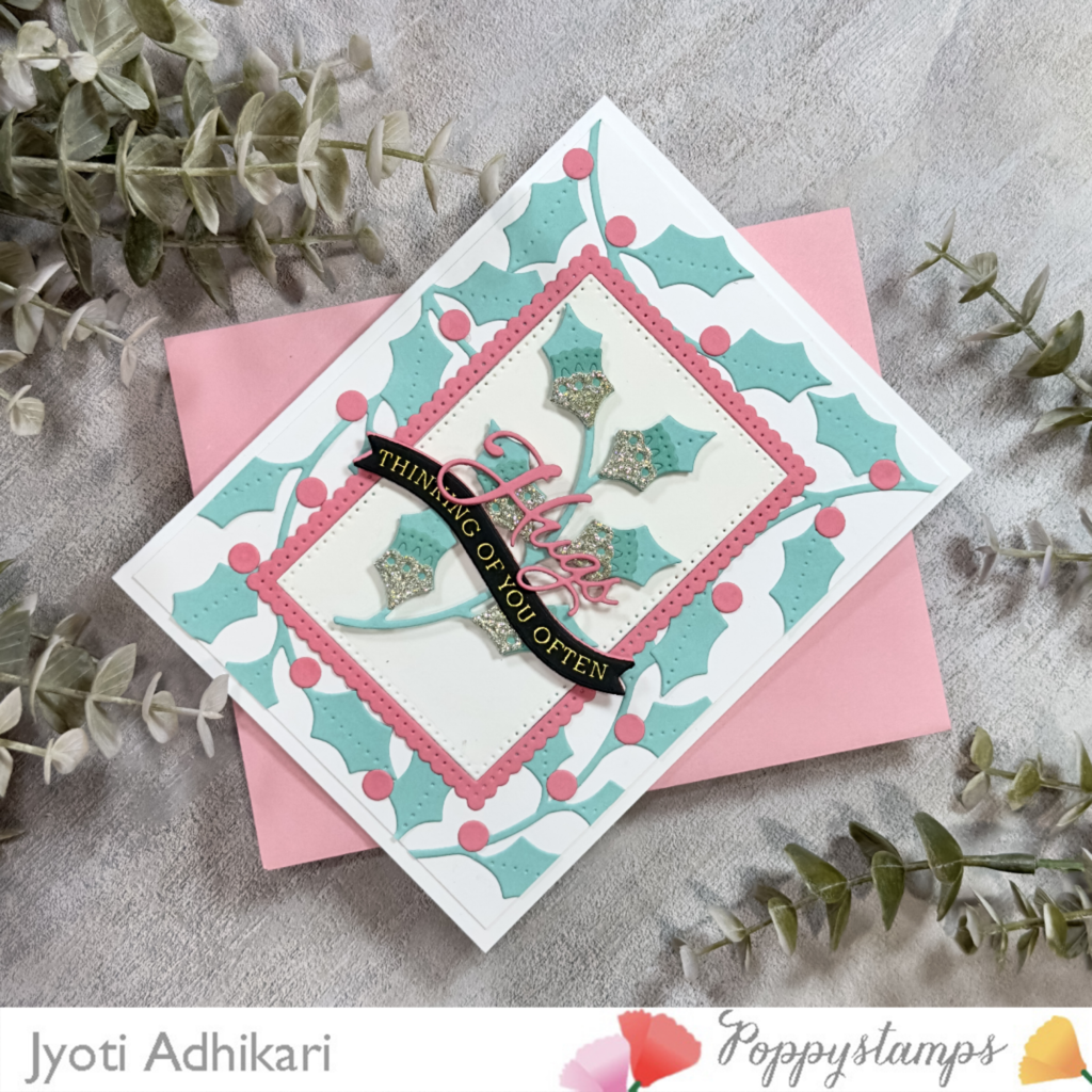 For the focal area, I layered Scalloped Pinpoint Frames, using pink cardstock for the outer scalloped frame and white for the inner panel. The details in the frames add texture and interest while keeping the design clean and structured. This framed area helps draw the eye directly to the sentiment and holly sprigs.