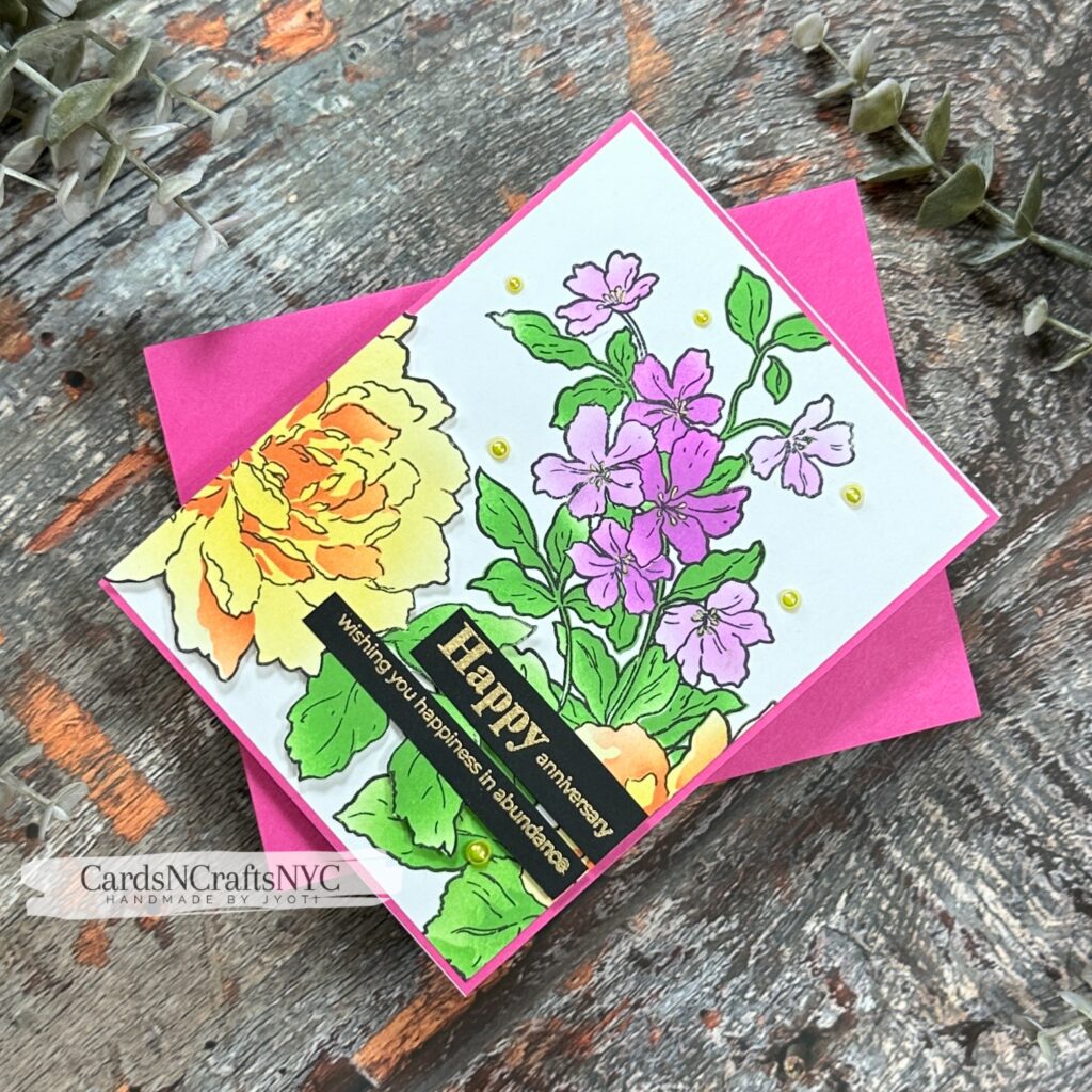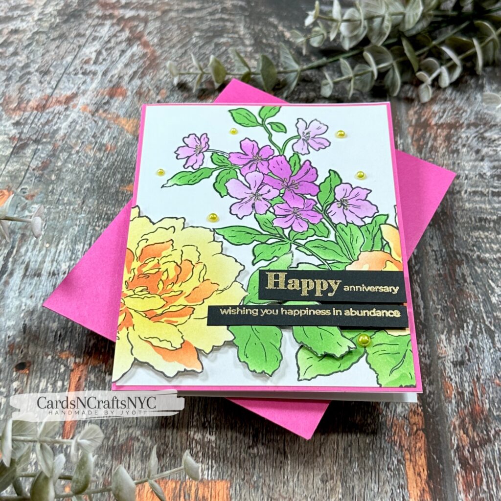 Large floral stamps are always fun to work with, and this beautiful image from the Altenew Build-A-Garden: Garland Grace (April subscription) made it easy to create a vibrant anniversary card. The oversized floral cluster fills most of the card front, and the coordinating stencils make coloring quick while still achieving beautiful blended shades. I paired cheerful purples, sunny yellows, and fresh greens to create a bright and happy design that feels perfect for celebrating a special anniversary.