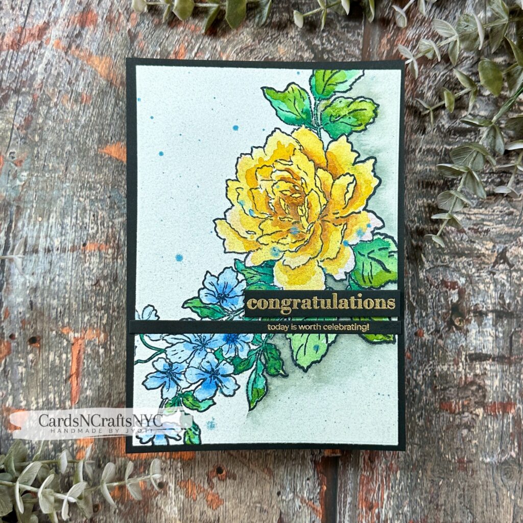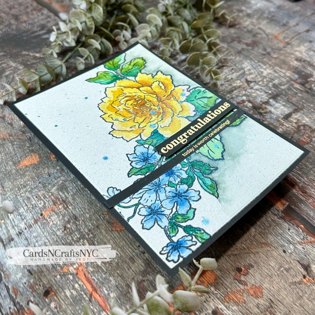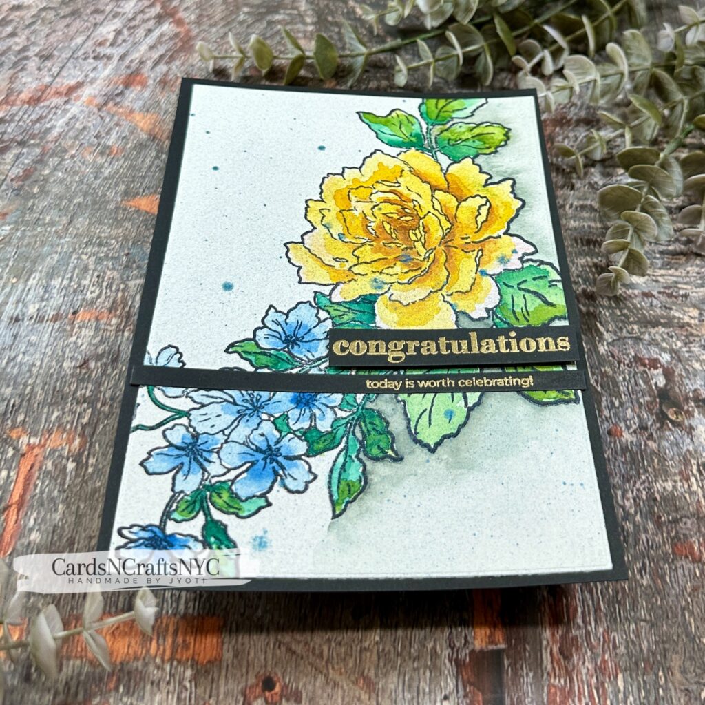To add texture and interest, I sprayed Distress Oxide Spritz in blue, creating soft splatters across the background. The sentiment from the same stamp set was heat embossed in gold on black cardstock, cut into strips, and adhered across the center with foam tape. This adds dimension while keeping the beautiful watercolor florals as the main focal point.