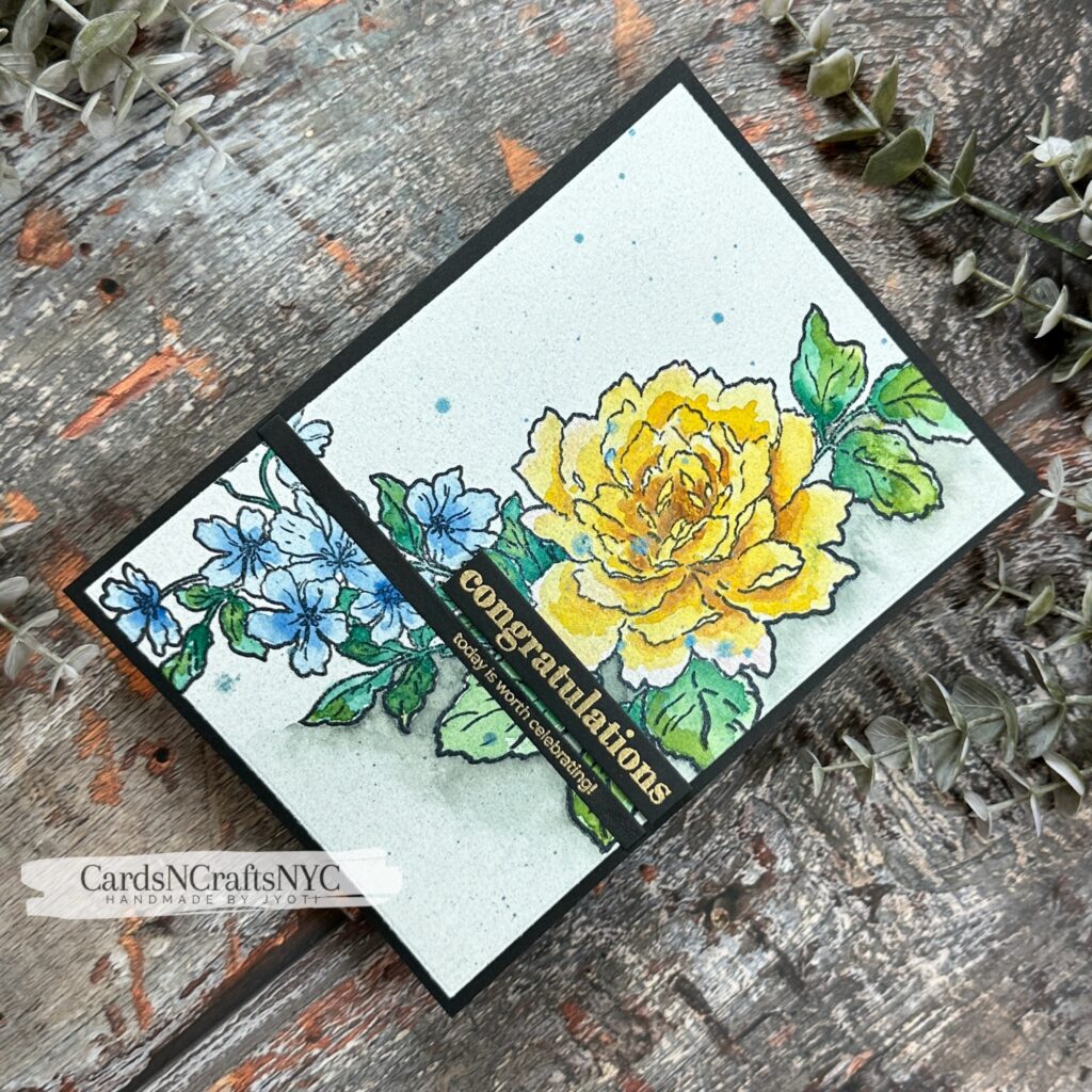 Since this floral stamp is so large and beautiful, I decided to make a 5×7 card so more of the image could be displayed. The larger card size allows the floral arrangement to shine without trimming away too much of the design. The watercolor panel was then mounted onto a black card panel, which helps frame the soft colors and gives the card a bold contrast.