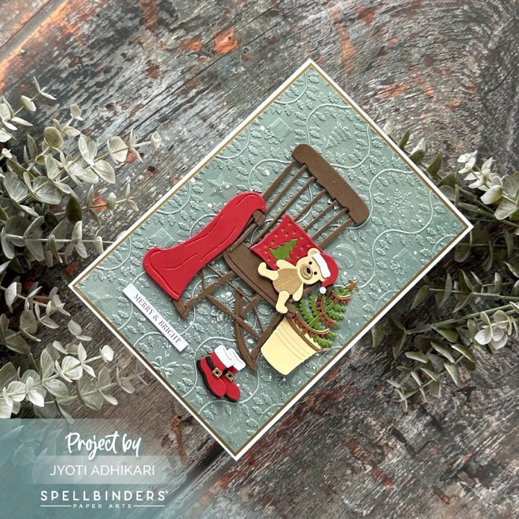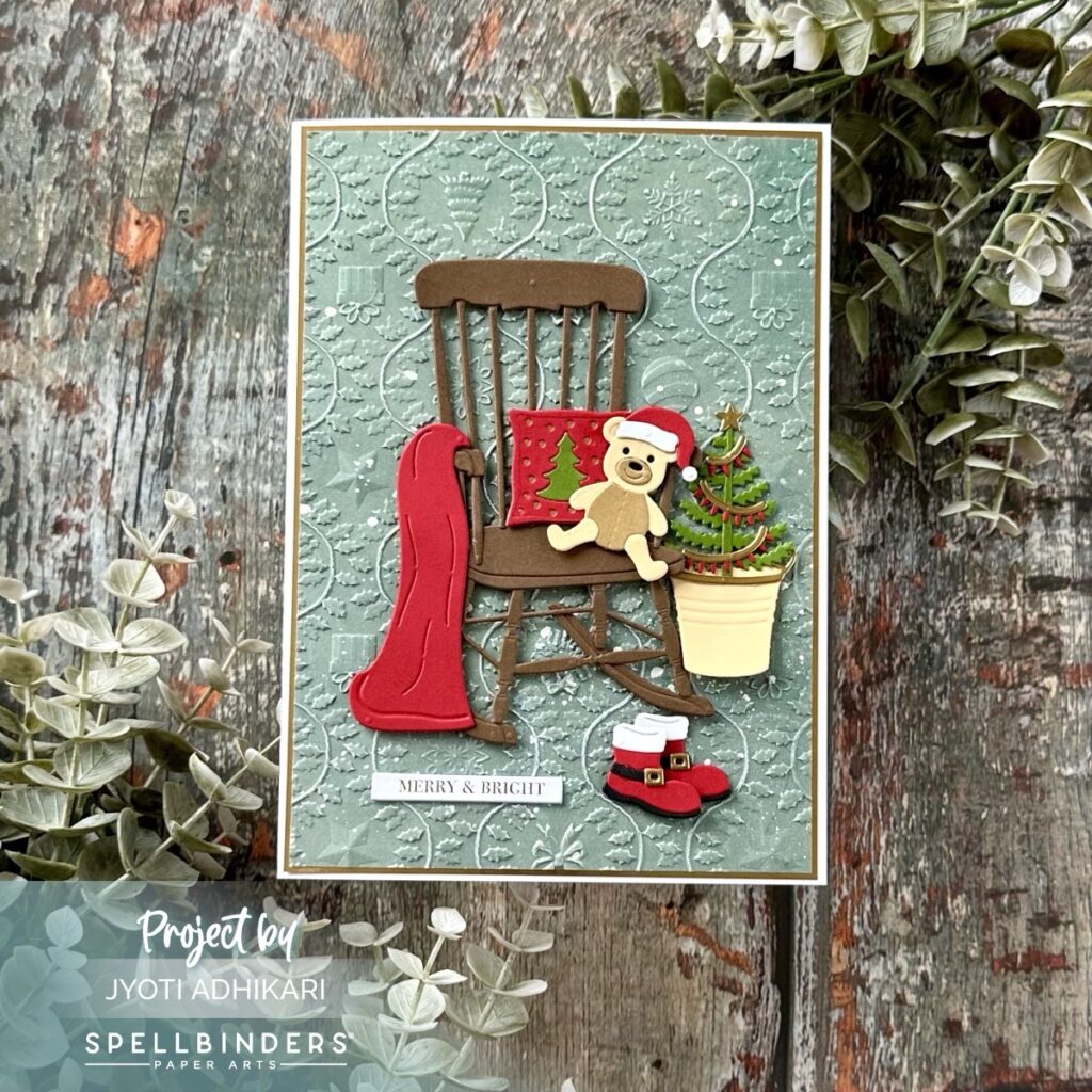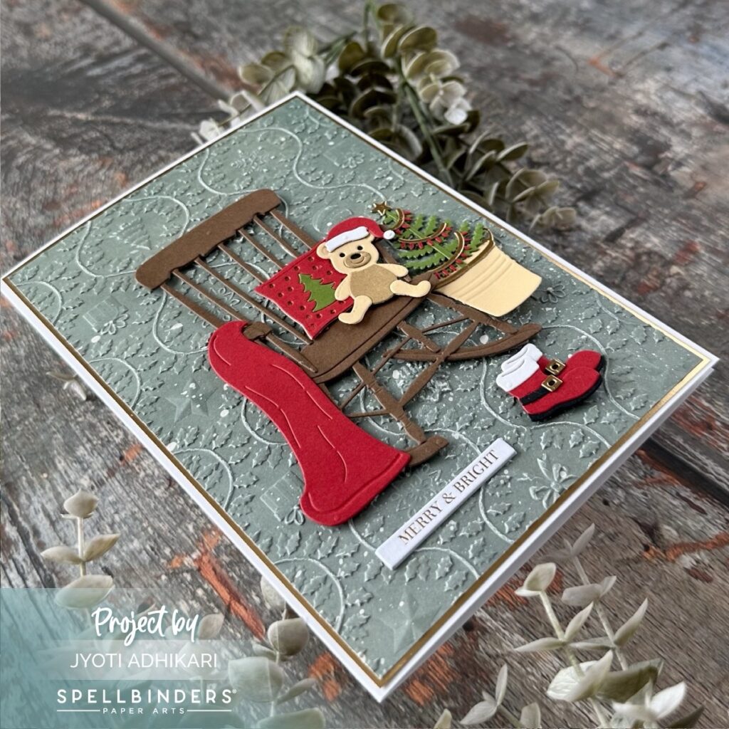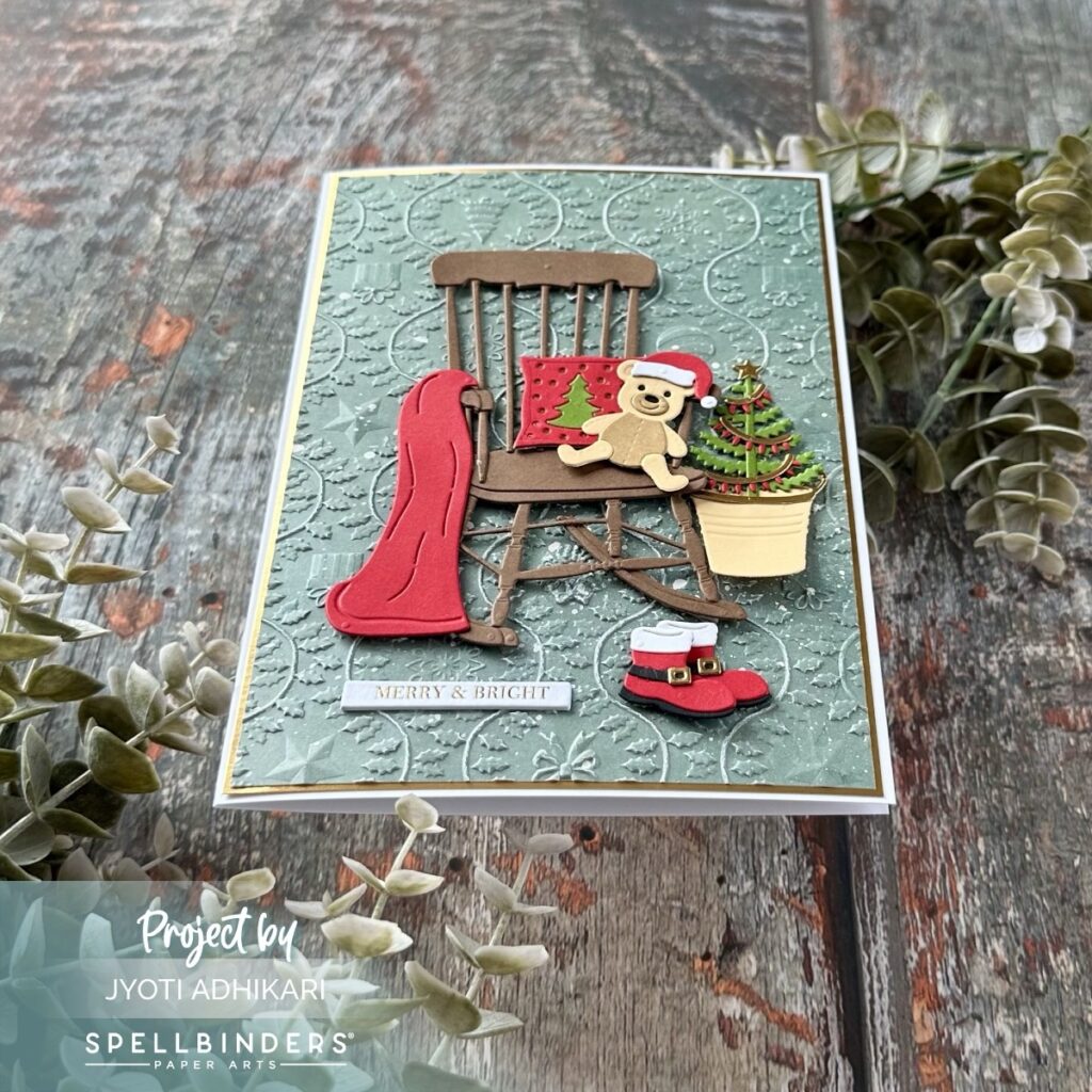 This card uses the Christmas Rocking Chair die set to build a cozy holiday nook. I began with a brown rocking chair as the focal point, placing it slightly off-center against the embossed green background to give the feeling of a decorated living space.