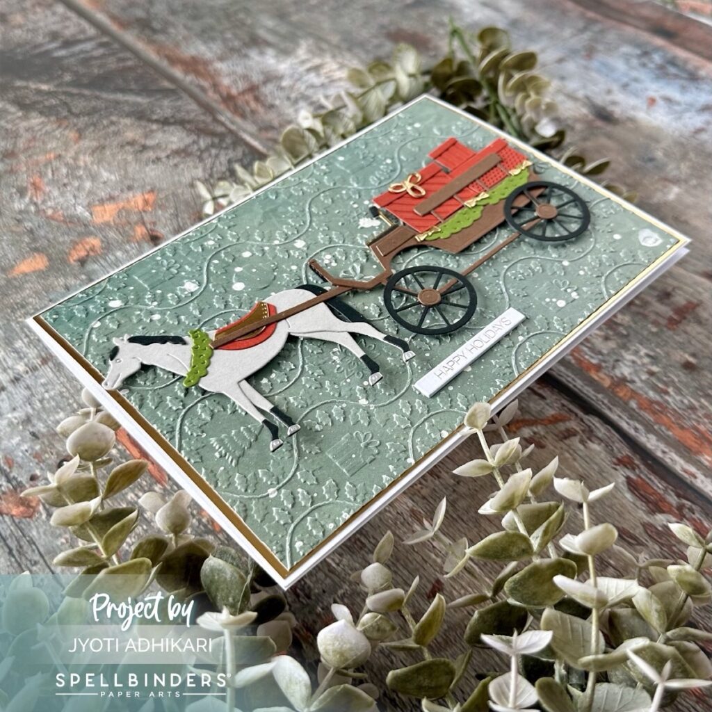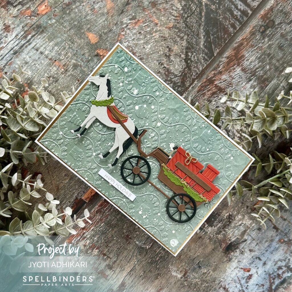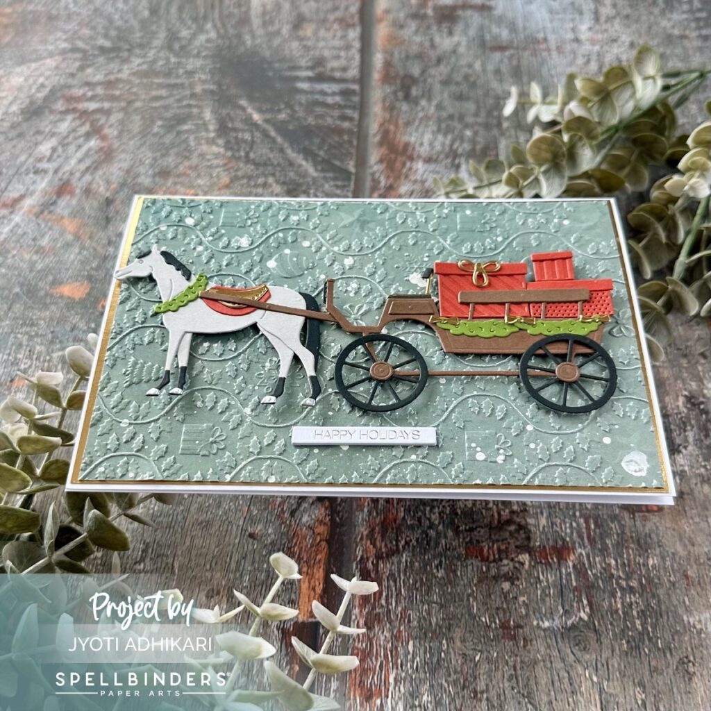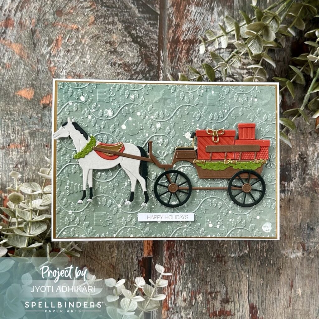 The Christmas Horse Drawn Wagon die set brought this elegant scene to life. I started with the horse, die-cutting it from cream cardstock and adding a black mane and tail. I decorated it with a green-and-red harness to give it a festive, classic touch.