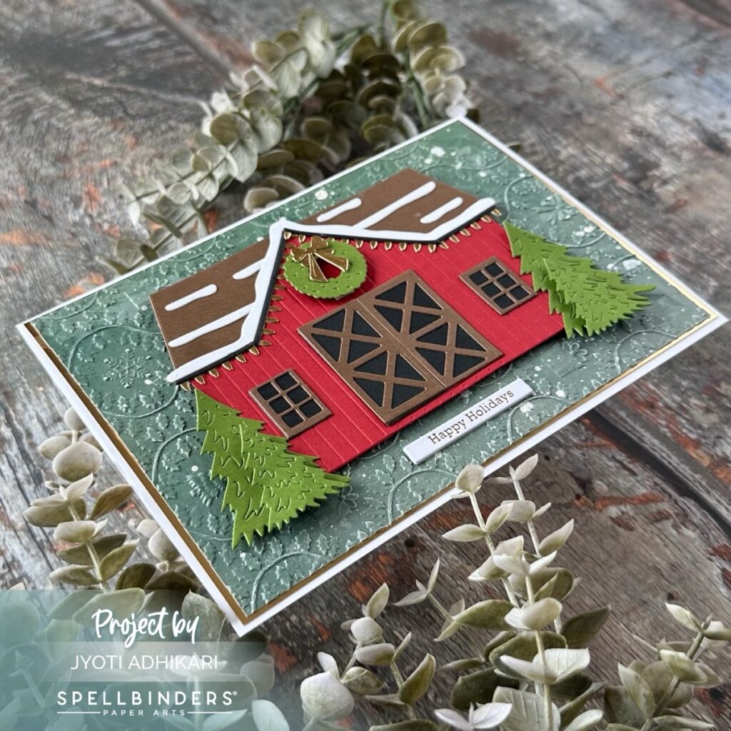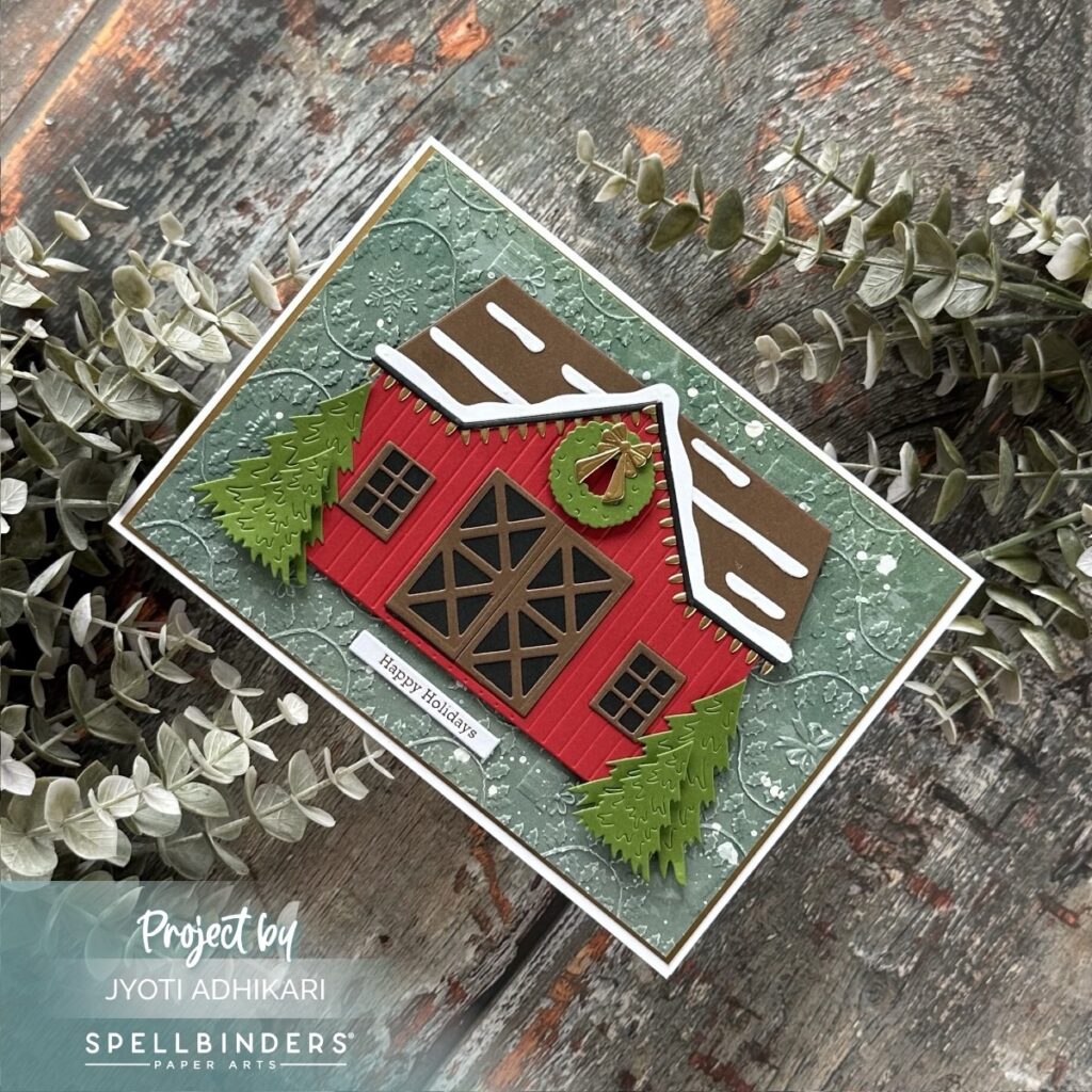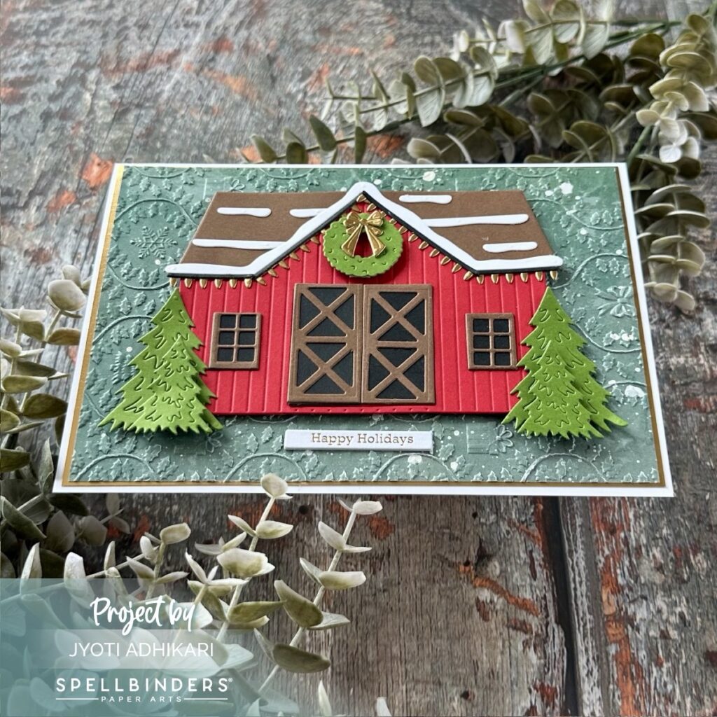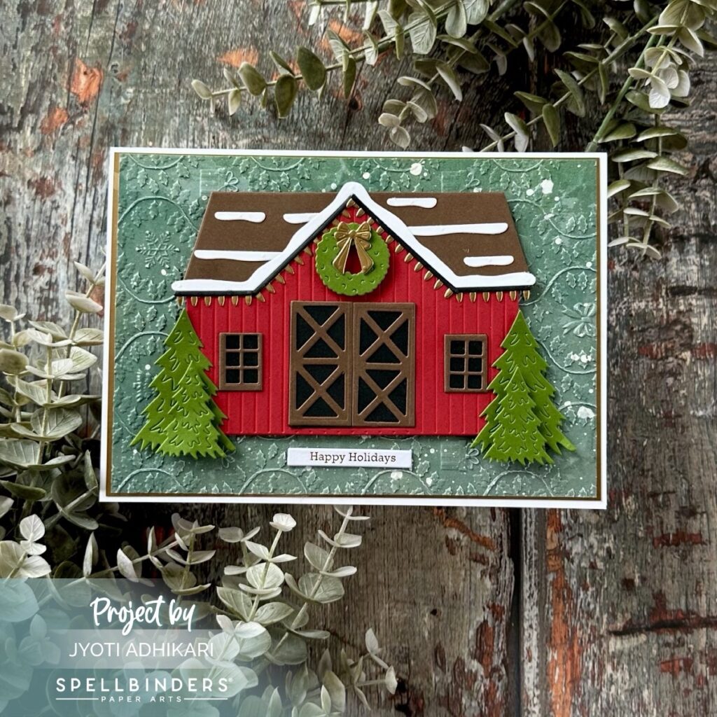 To start this card, I used the Country Christmas Barn die set to create a traditional red barn, cutting the main structure from red cardstock and layering the roof and doors in brown. I added white snow accents to the roof for a frosty winter feel and topped the barn with a mini green wreath to bring in holiday charm.