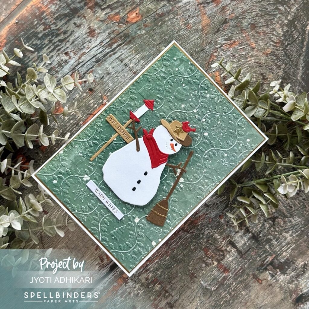 The background panel was cut from patterned green paper and run through the Country Christmas 3D Embossing Folder to add swirls and snowflake textures. I splattered white gouache over the panel to mimic falling snow, which added a subtle and cohesive wintery touch.