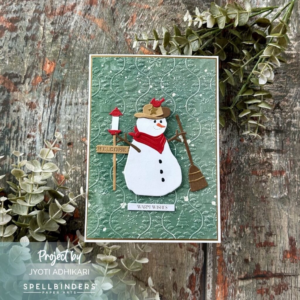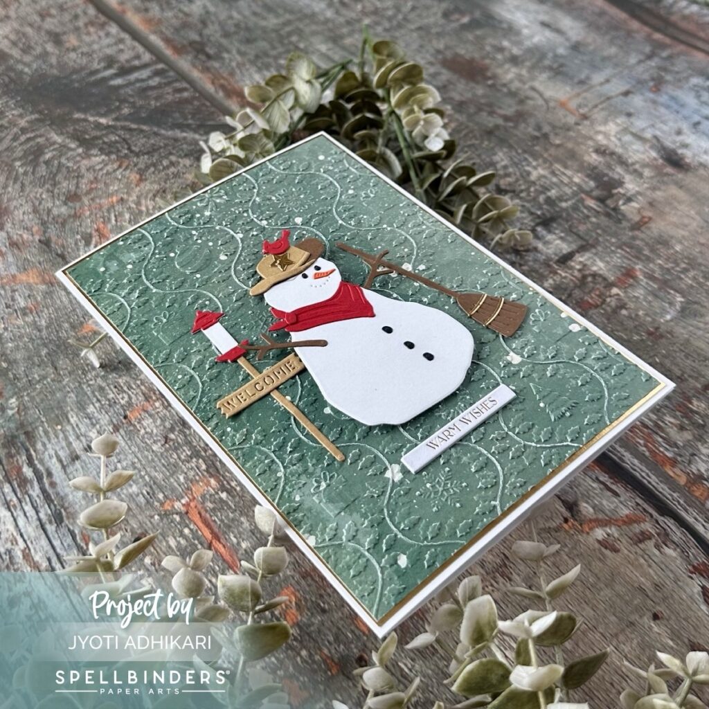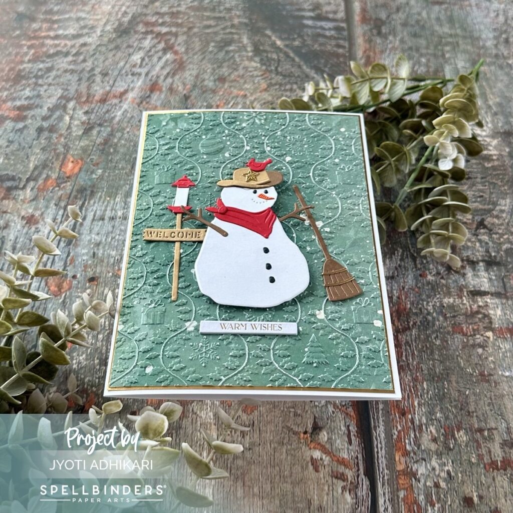 Using the Country Snowman die set, I created a cheerful snowman in white with black buttons, a red scarf, and a tan hat. I perched a redbird on his brim for a festive touch and gave him a happy expression that brings life to the character.