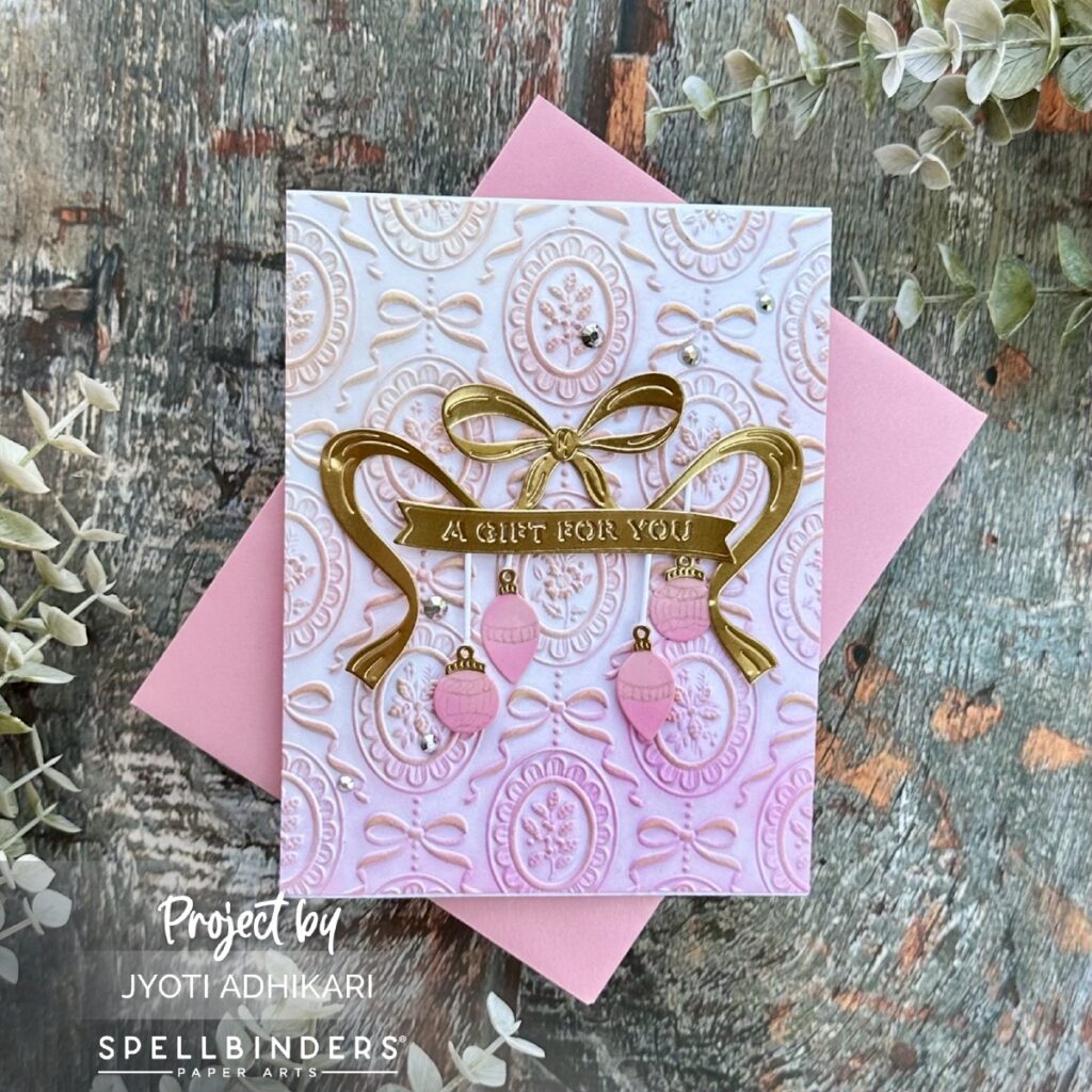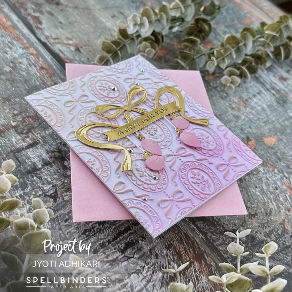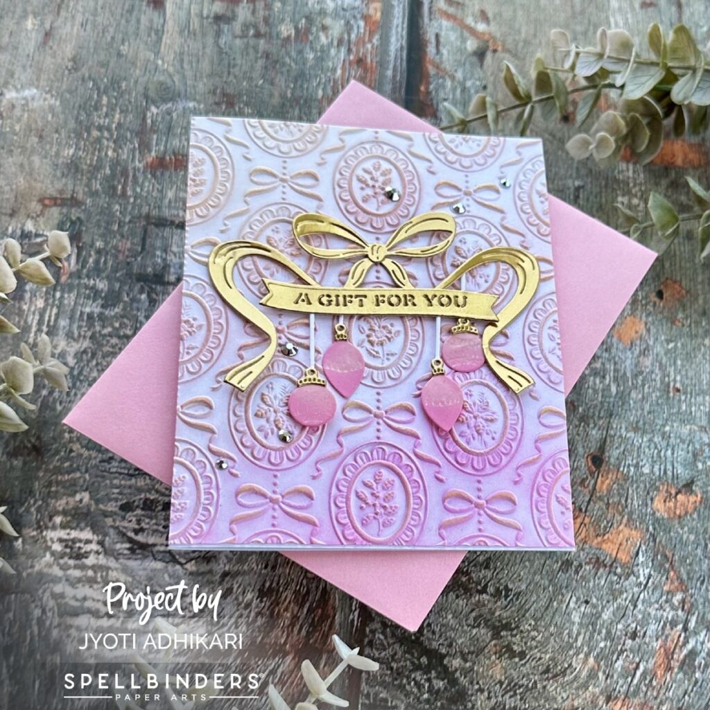 For the sentiment, I used the “A Gift for You” banner from the Gifting Bow Etched Dies. Die cut in the same mirror gold, it sits perfectly across the bow and pulls the whole composition together. A few gems add sparkle and finish off this pretty-in-pink design.