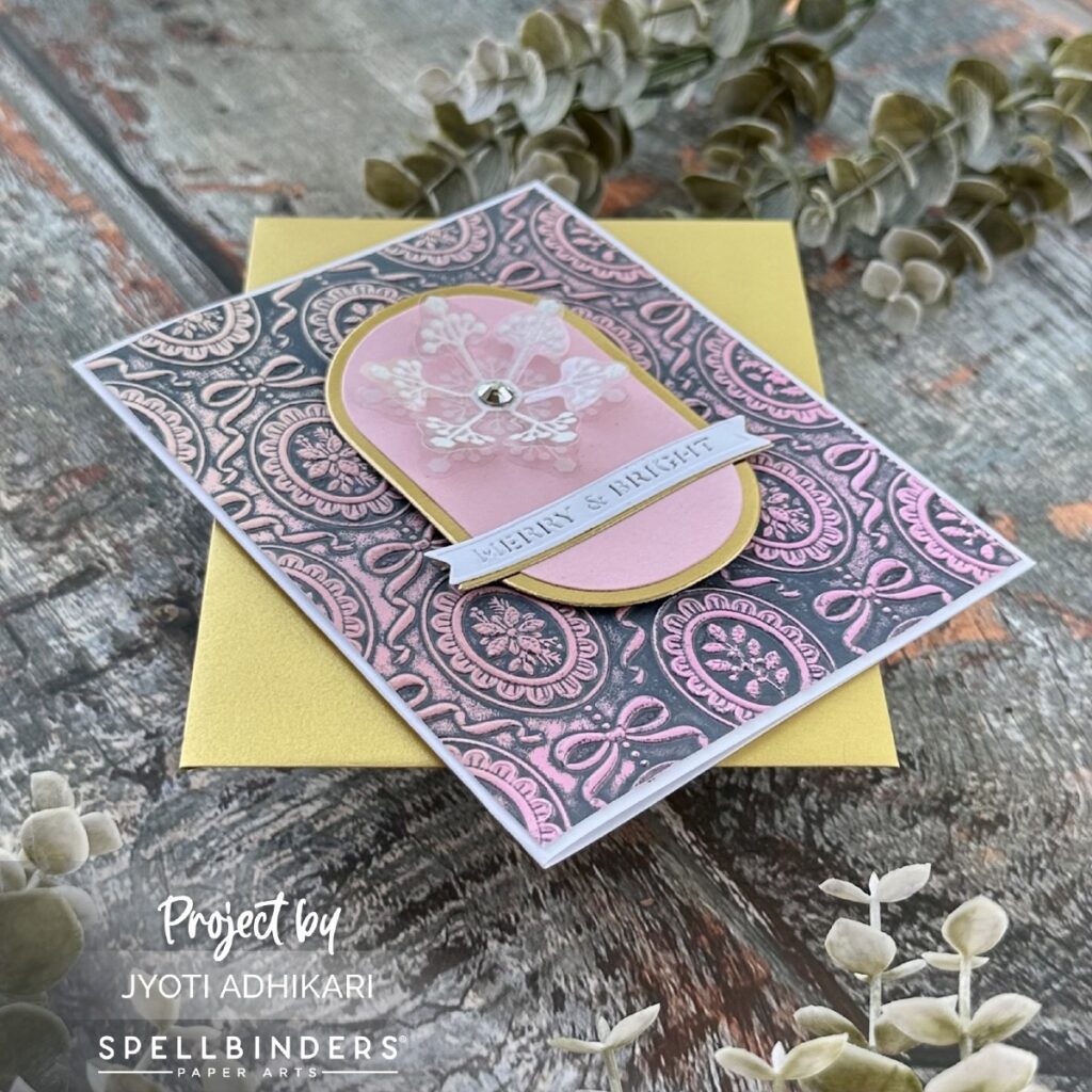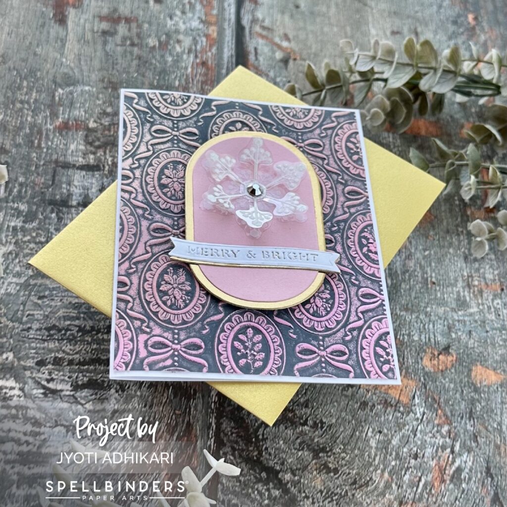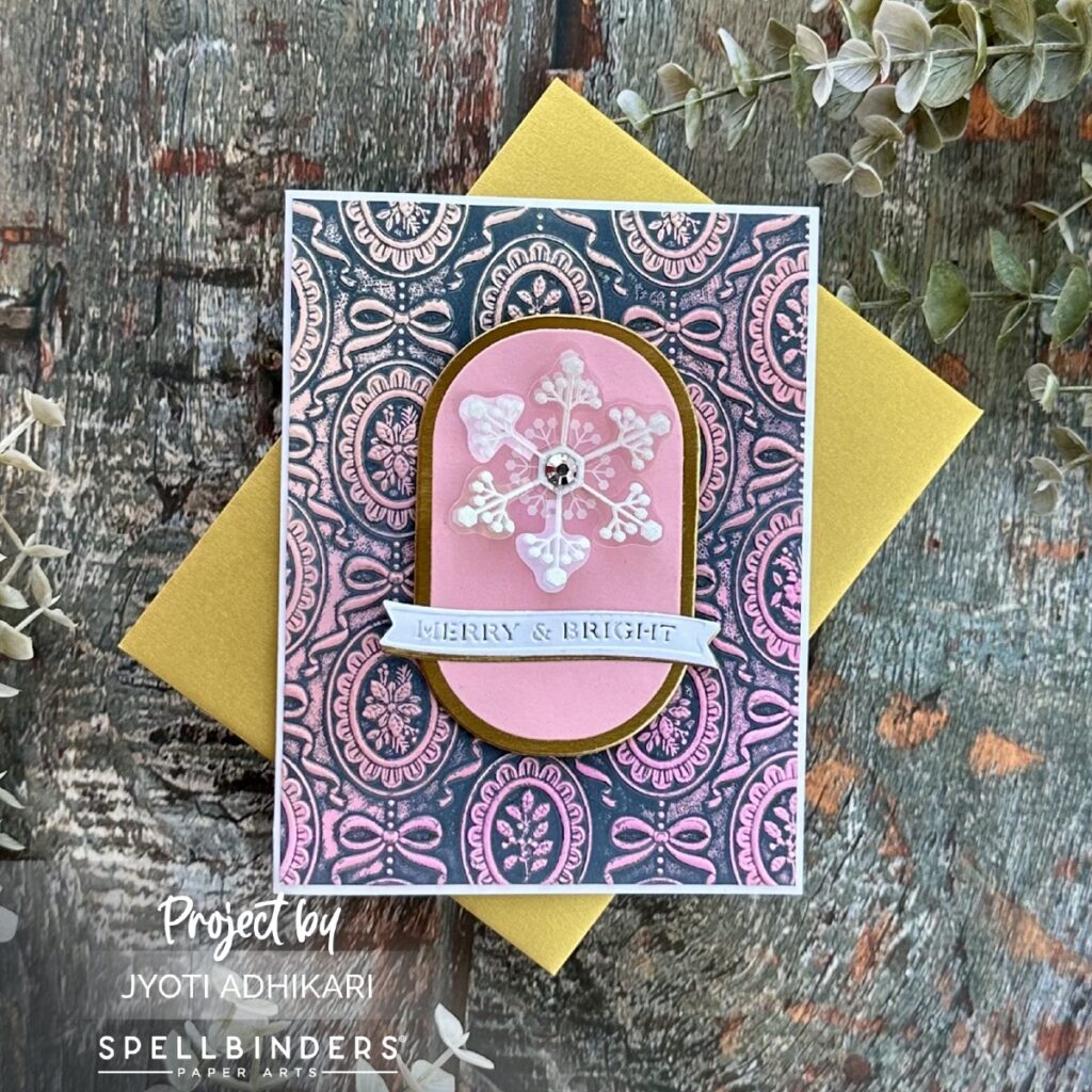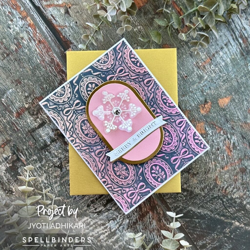 To build my focal area, I used an oval frame die in gold and layered it with pink cardstock on top. This oval serves as a clean canvas for the snowflake, helping it pop off the textured background.
