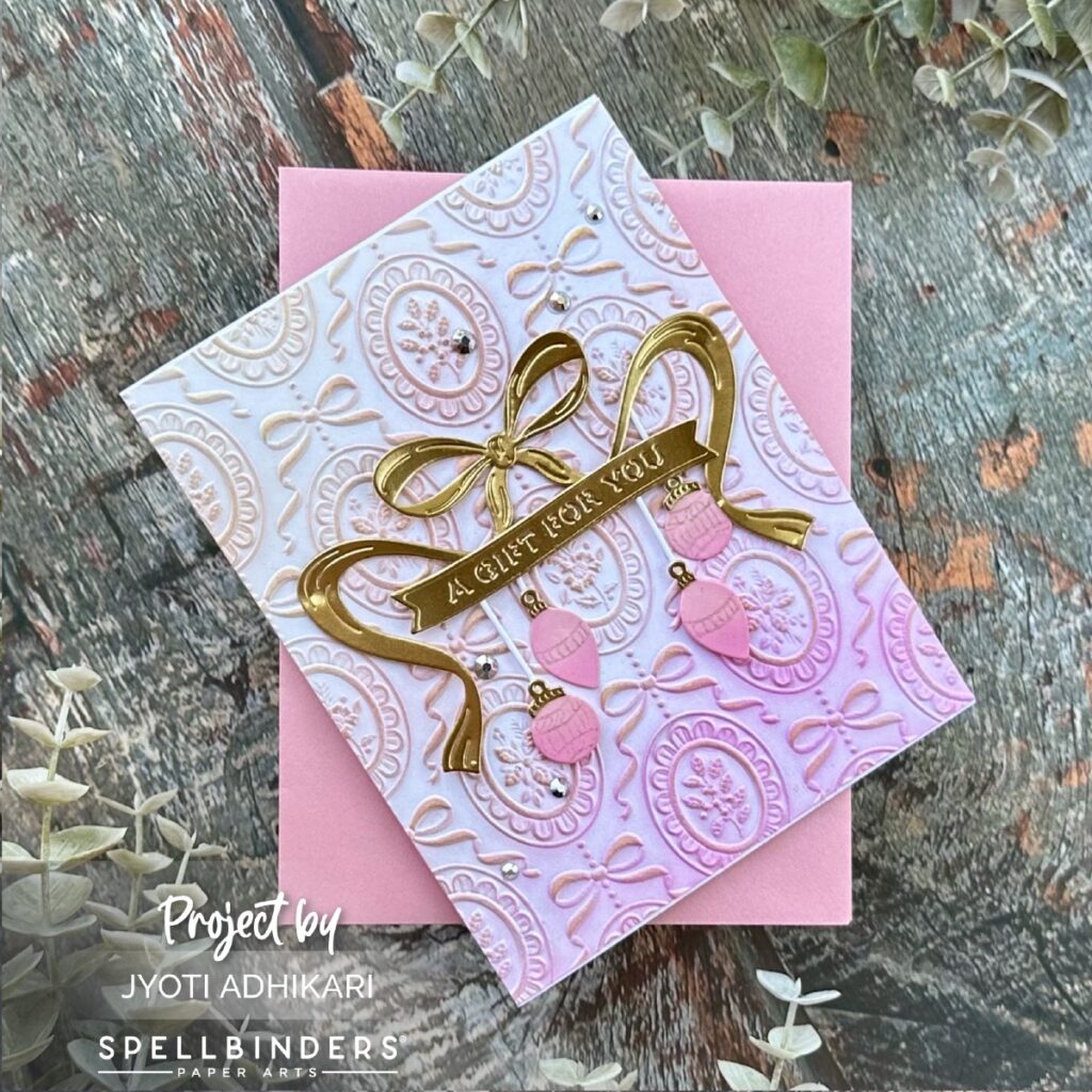 I added three pink ornaments below the bow using the small bauble elements included in the same die set. They were cut from coordinating pink cardstock, and I added subtle detailing to them for texture. I love how they look like they’re gently hanging from the ribbon tails.