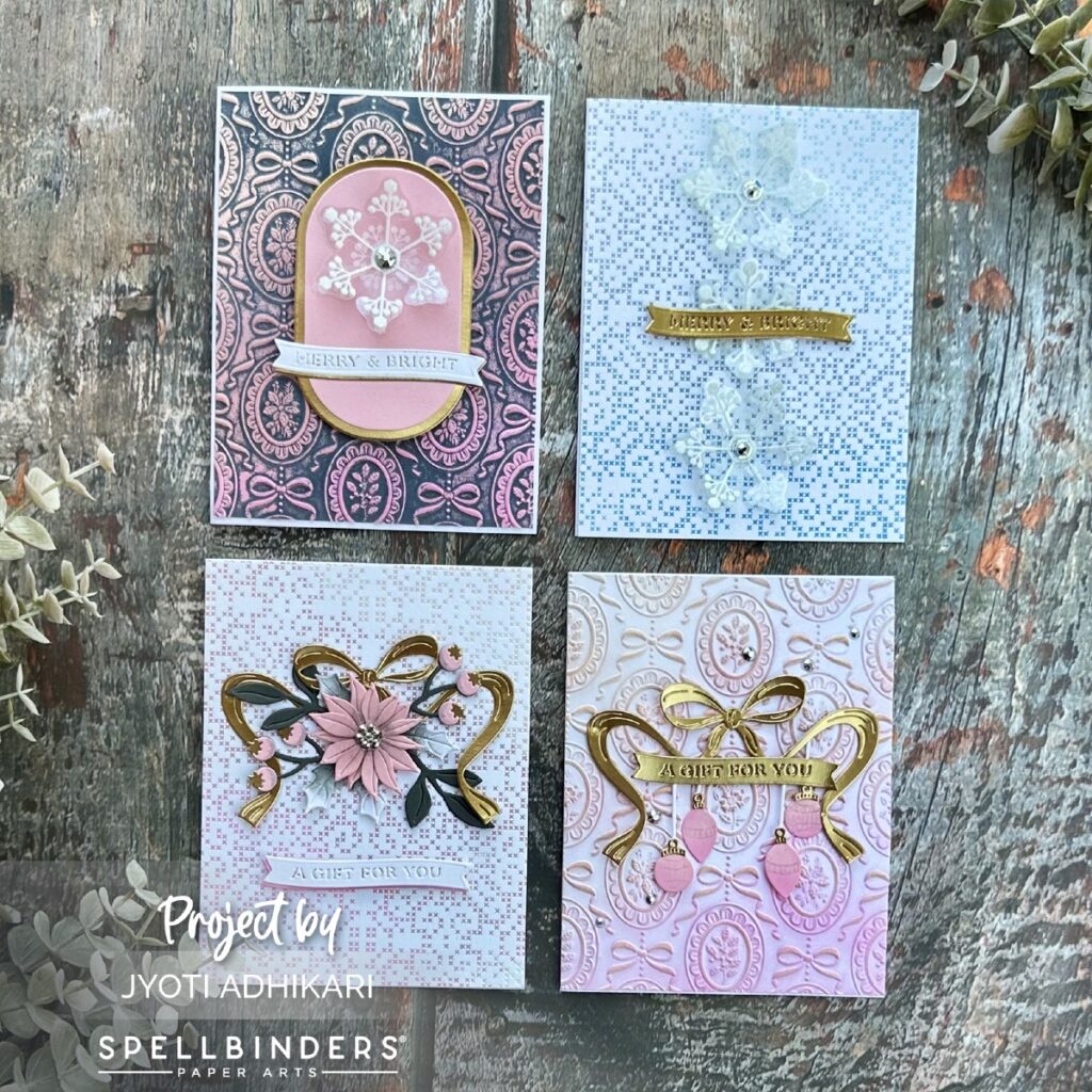 The holiday season is the perfect time to craft with shimmer, texture, and joy-and the new Merry Moments Collection from Spellbinders brings all of that and more. Today I’m sharing four holiday cards featuring the Christmas Cameos 3D Embossing Folder, Petite Criss Cross Press Plate, Gifting Bow Etched Dies, and Merry Moments Dimensional Snowflakes. Each card highlights a different combination of these stunning products, and I hope they inspire you as much as they inspired me.