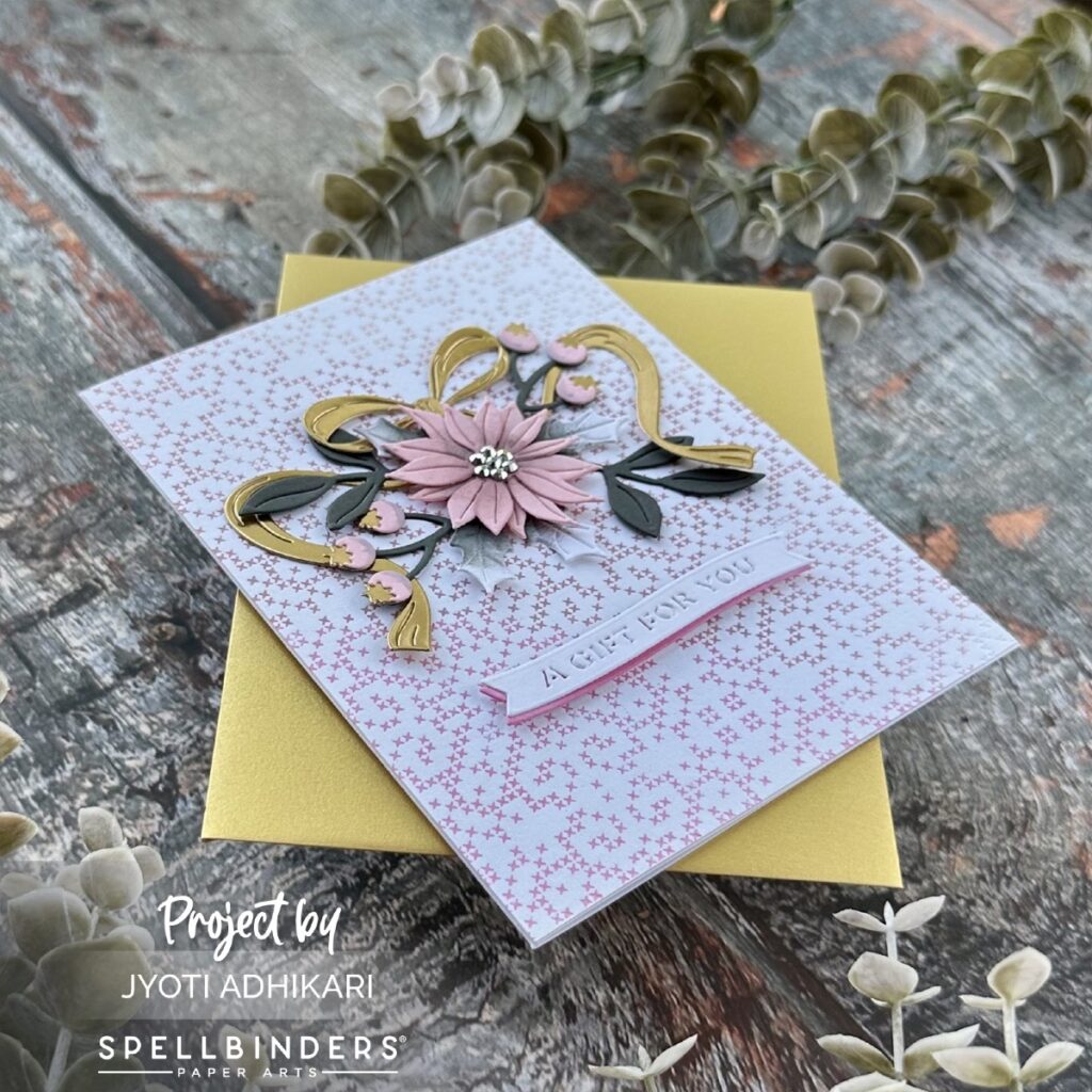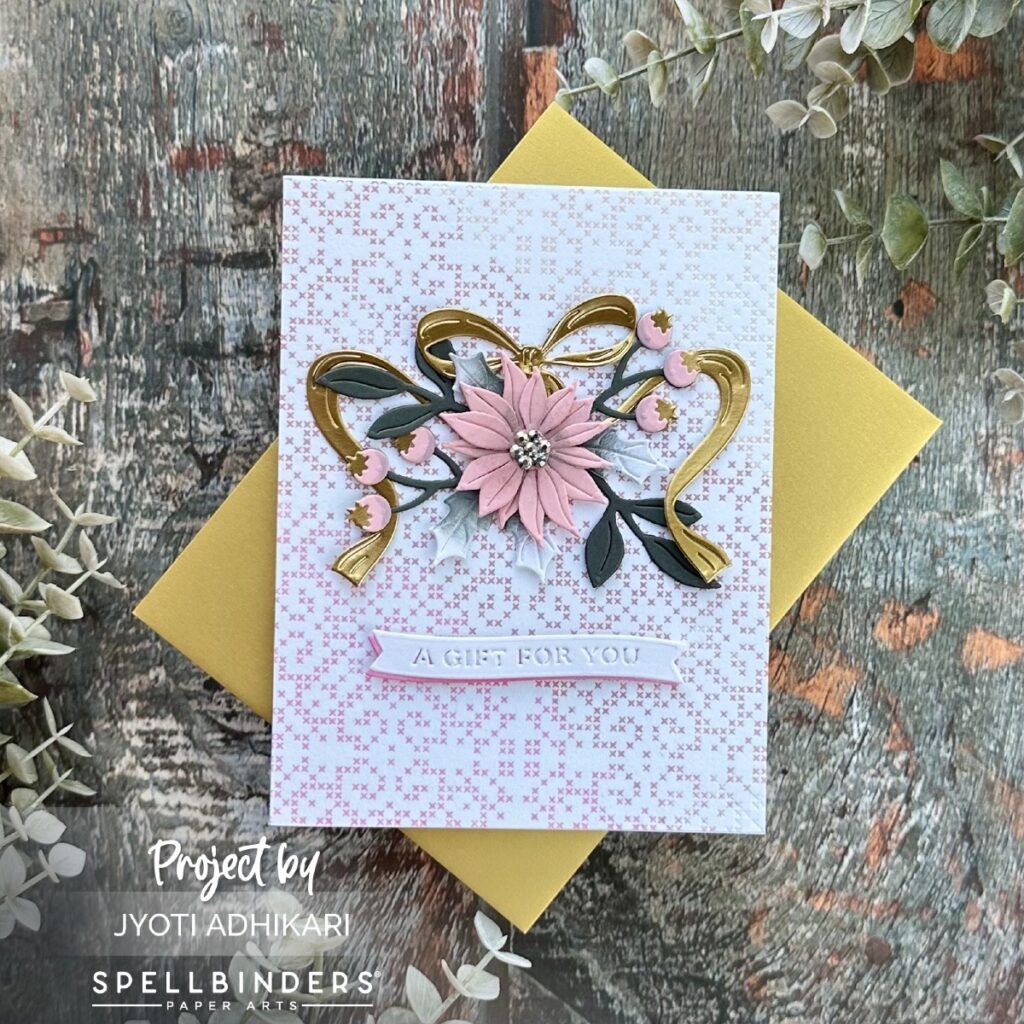 The showstopper is the large pink poinsettia, which I built using the floral pieces in the Gifting Bow Etched Dies. I layered multiple petal cuts in pink and added gray and metallic gold foliage around it for contrast and holiday flair.