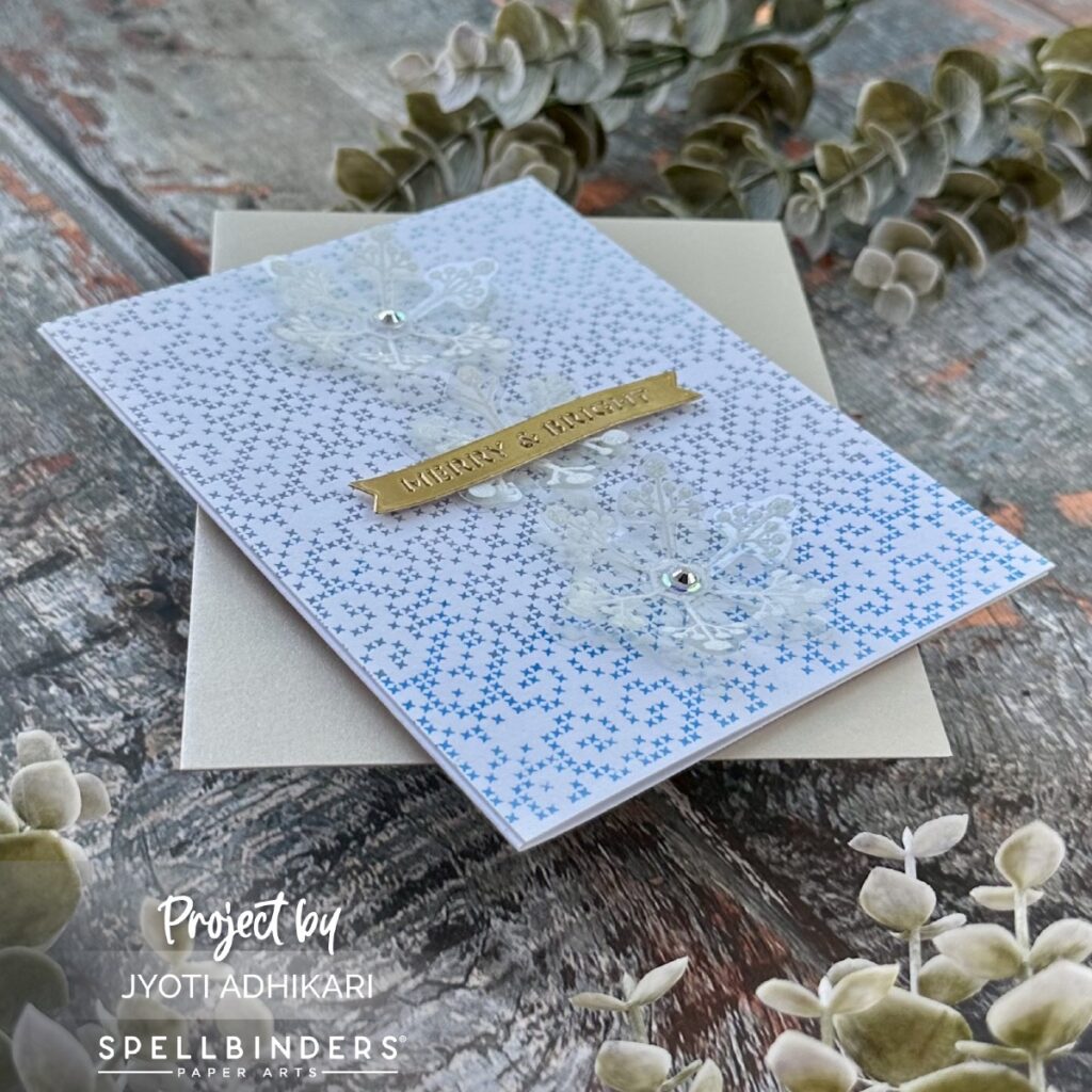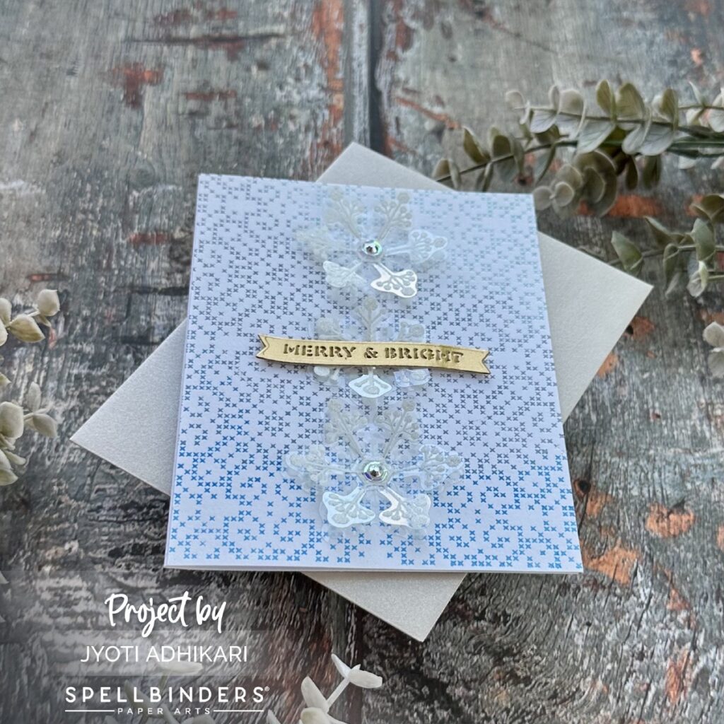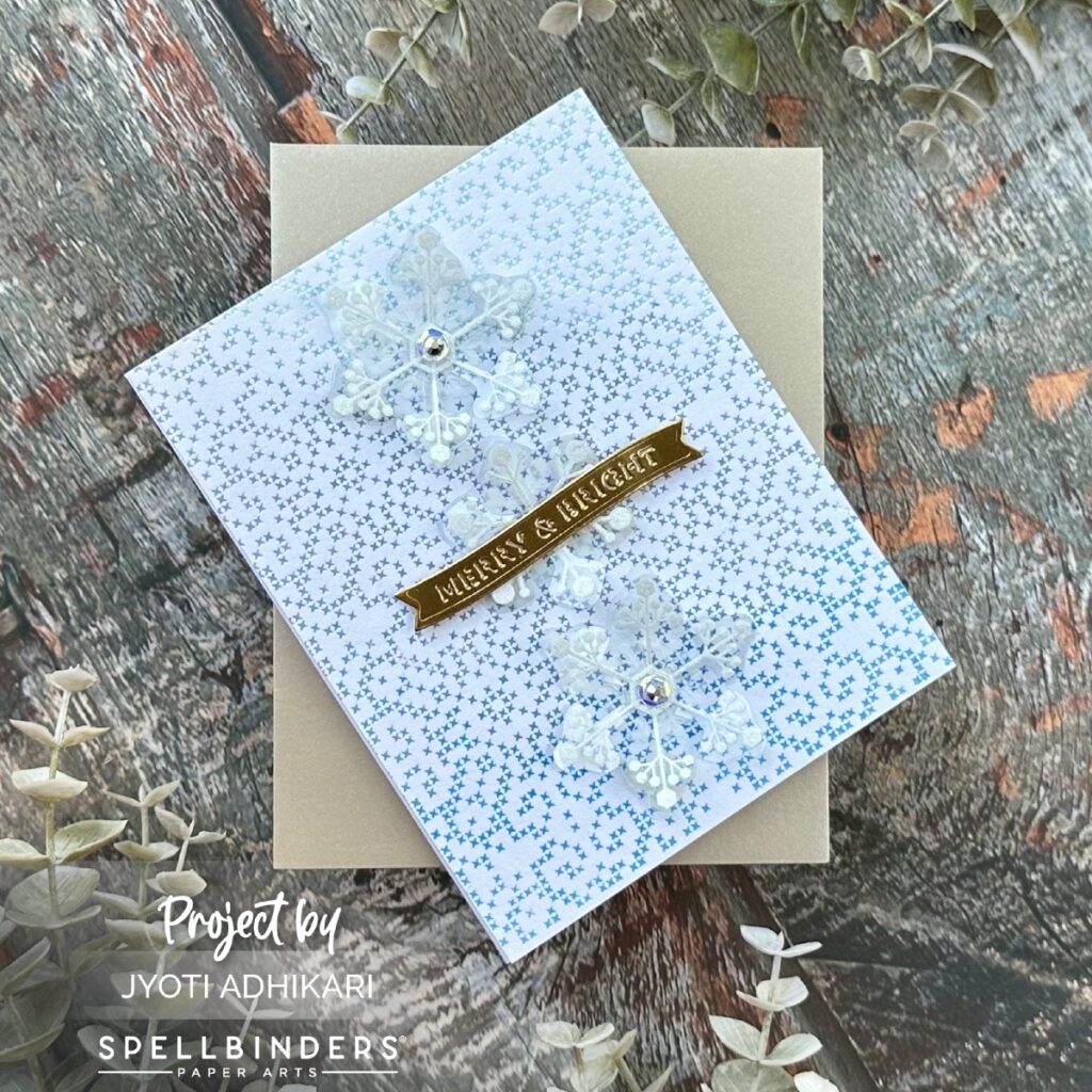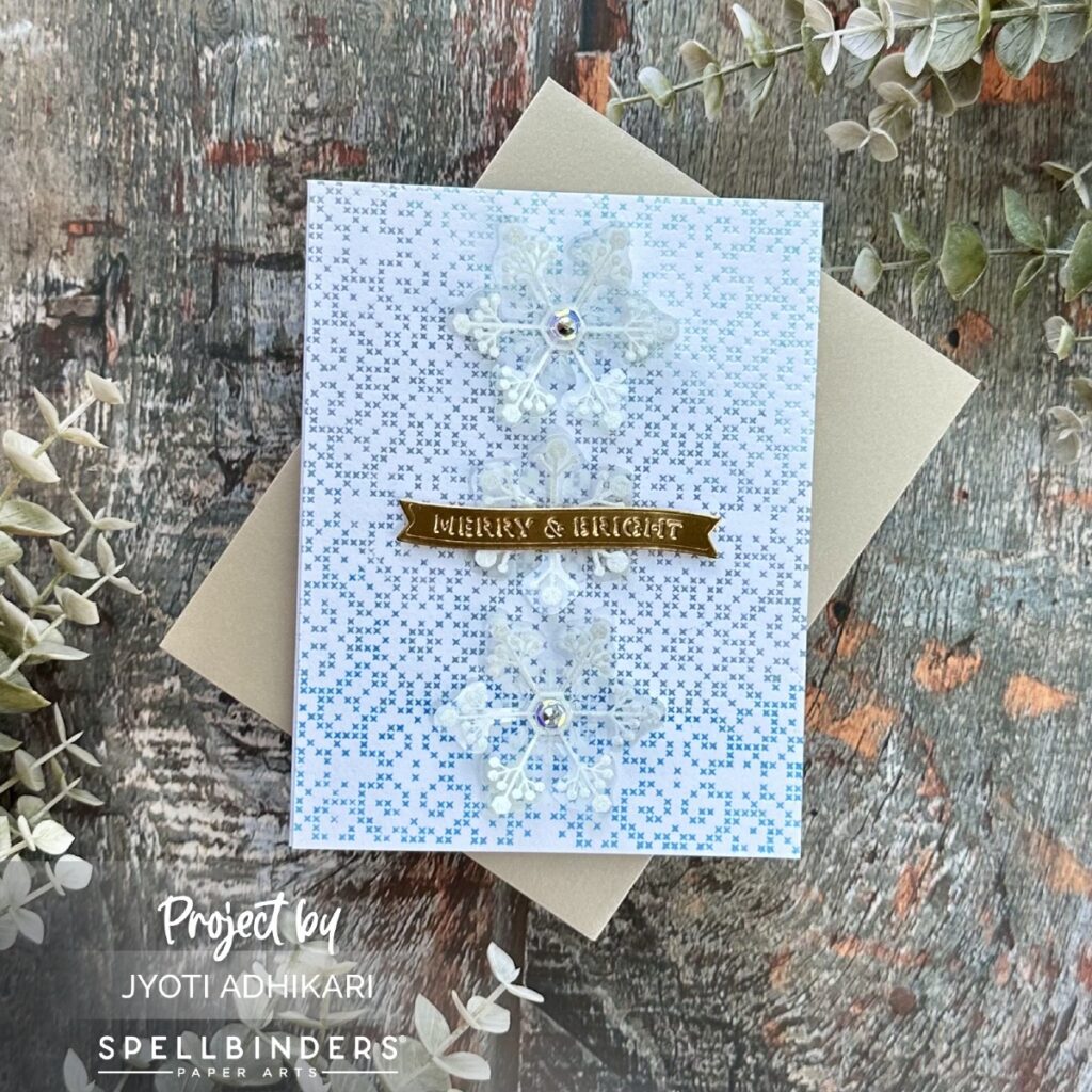 I chose a sentiment from my foil greeting stash that says “Merry & Bright.” The banner shape works beautifully over the center snowflake, and I die cut it from gold cardstock to coordinate with the soft icy theme.