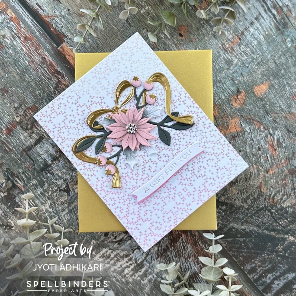 To frame the floral cluster, I used the large bow again from the Gifting Bow Etched Dies, cutting it from mirror gold. It arches beautifully around the poinsettia and gives the card a luxe presentation.