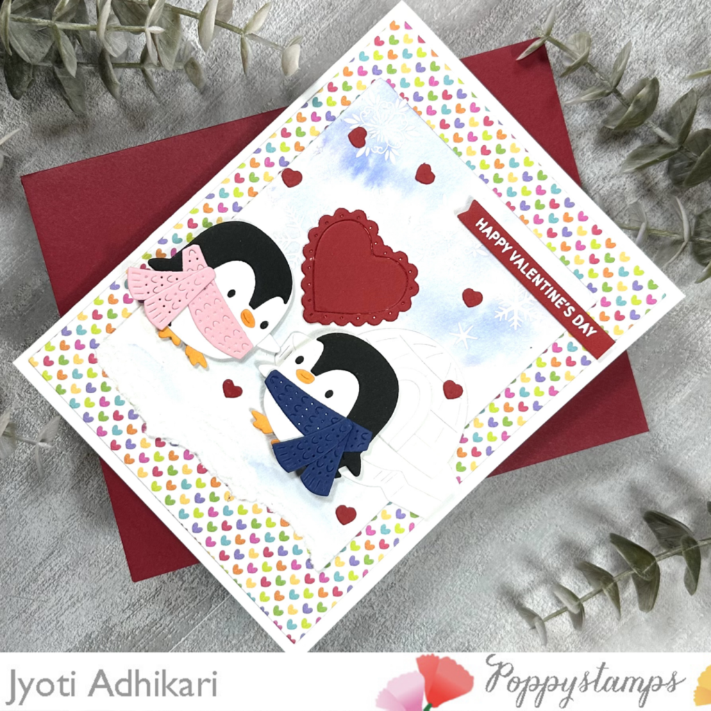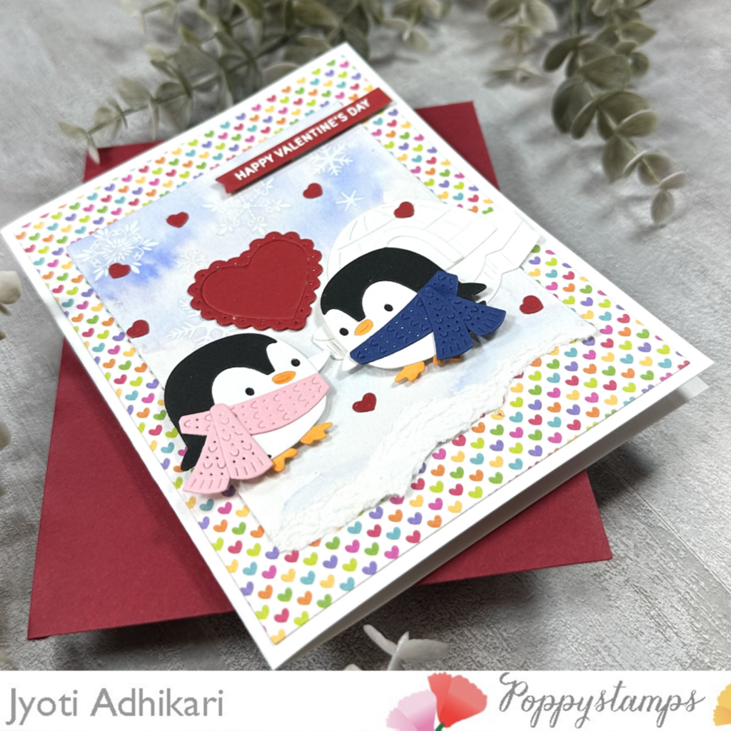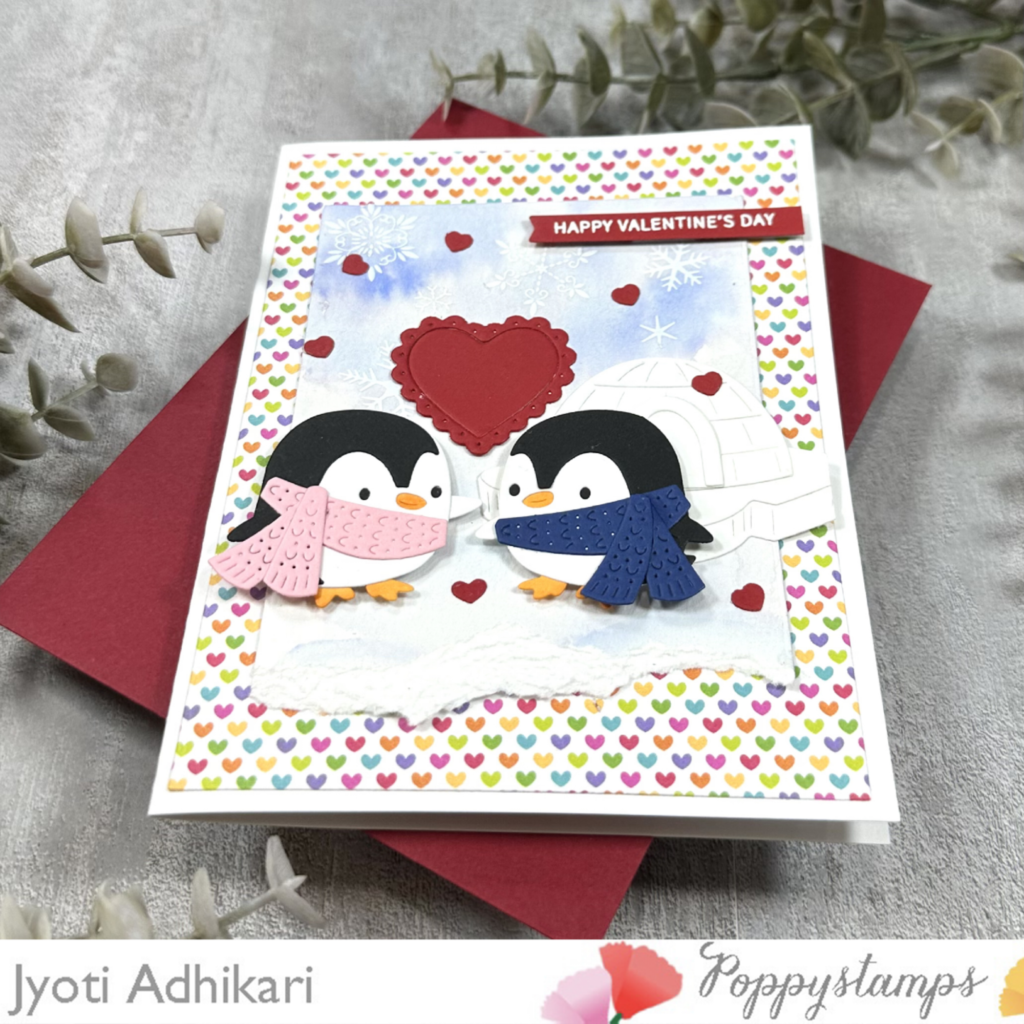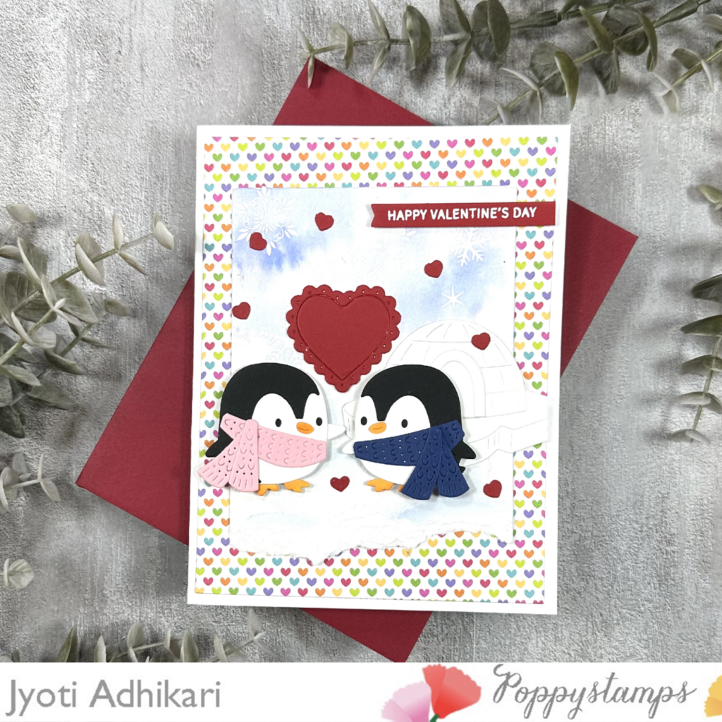 Valentine’s Day always calls for something sweet, playful, and filled with heart and what could be cuter than two bundled-up penguins sharing a moment in the snow? For today’s card, I created a cozy winter Valentine using some of my favorite Poppystamps dies, pairing them with cheerful patterned paper from my stash. The result is a whimsical, layered design that feels both festive and heartfelt.