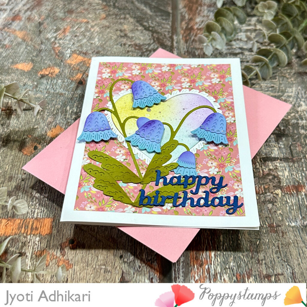 The die-cut flowers were popped up with foam adhesive to create dimension and movement. I love how the curved stems naturally guide your eye across the card. The delicate fringe detail around the heart adds just enough texture without making the card feel busy.