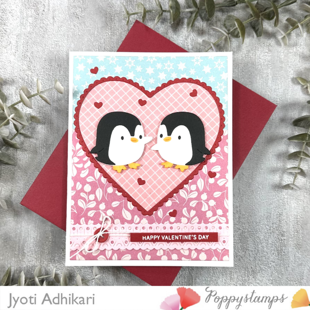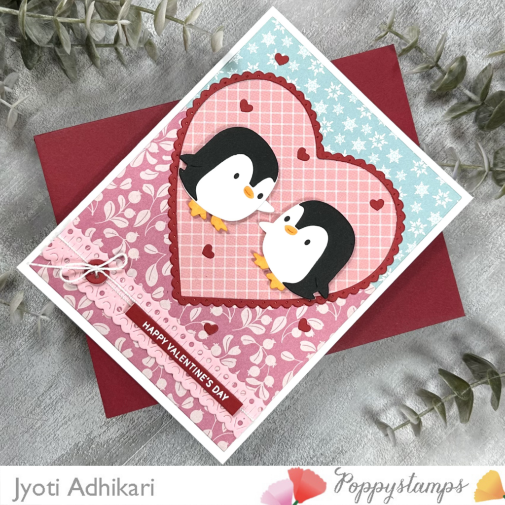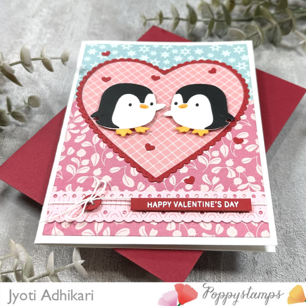 There’s something irresistibly charming about penguins, and for this Valentine’s Day card I leaned fully into that cuteness. I paired the Jubilee Penguin and Birthday Penguin dies as my focal images, letting them face each other inside a large heart to create a sweet, storybook moment that feels playful and heartfelt at the same time.