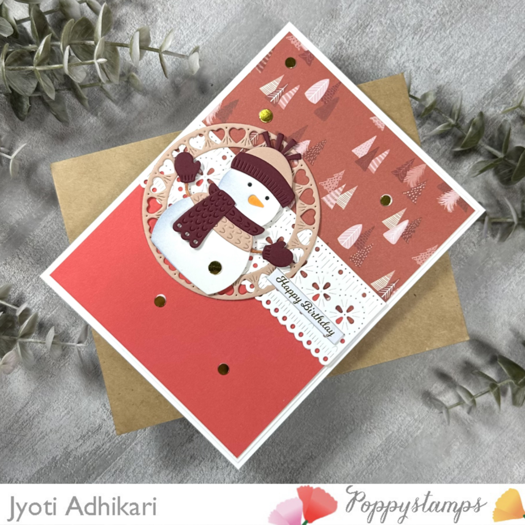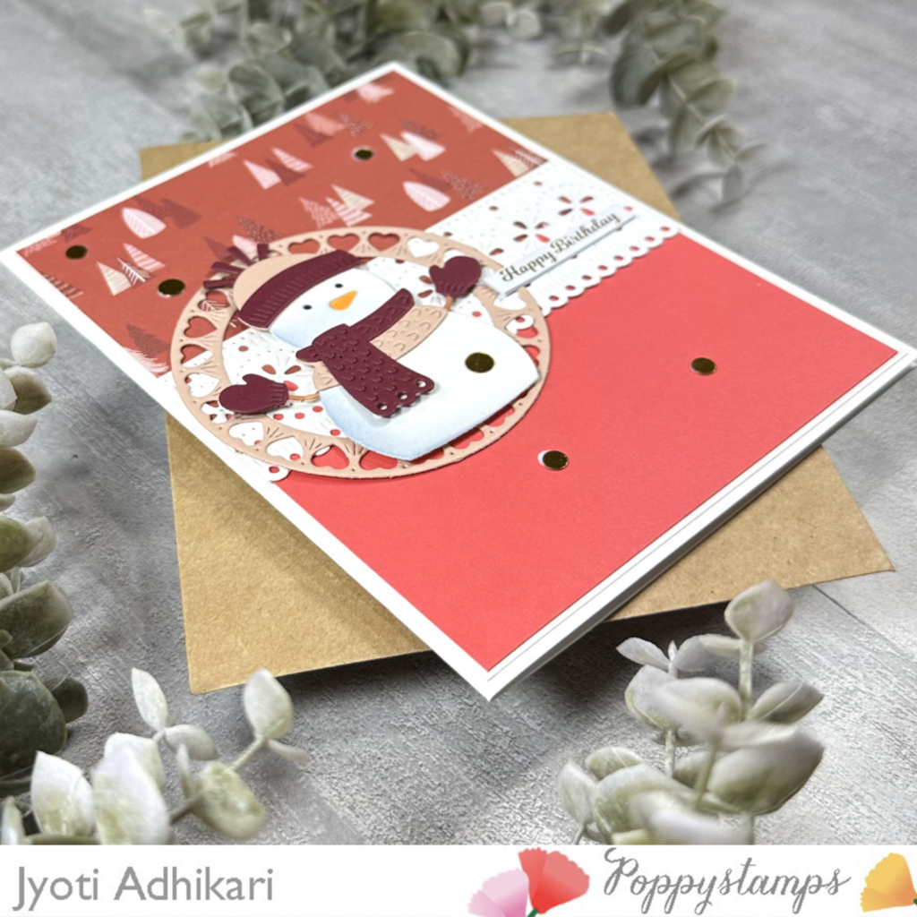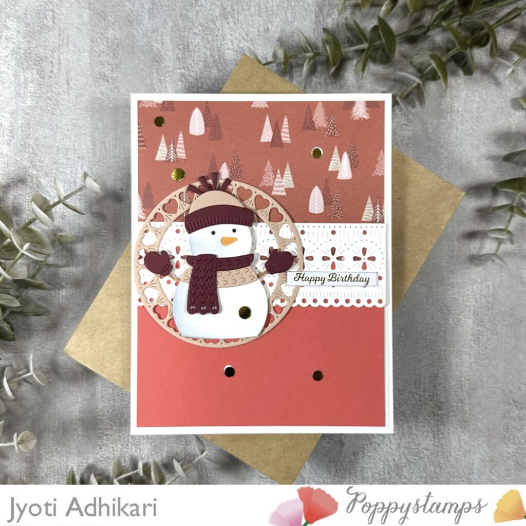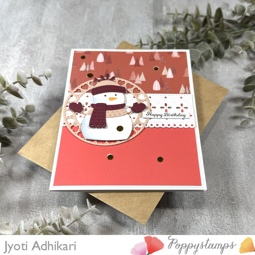 There’s something so heartwarming about combining winter elements with a birthday theme. Today’s card features the sweetest snowman nestled inside layered Nordic details, creating a cozy yet festive look. I love how the rich, warm tones from the patterned papers make this winter card feel cheerful rather than chilly. The mix of texture, layering, and delicate die-cut details brings everything together beautifully.